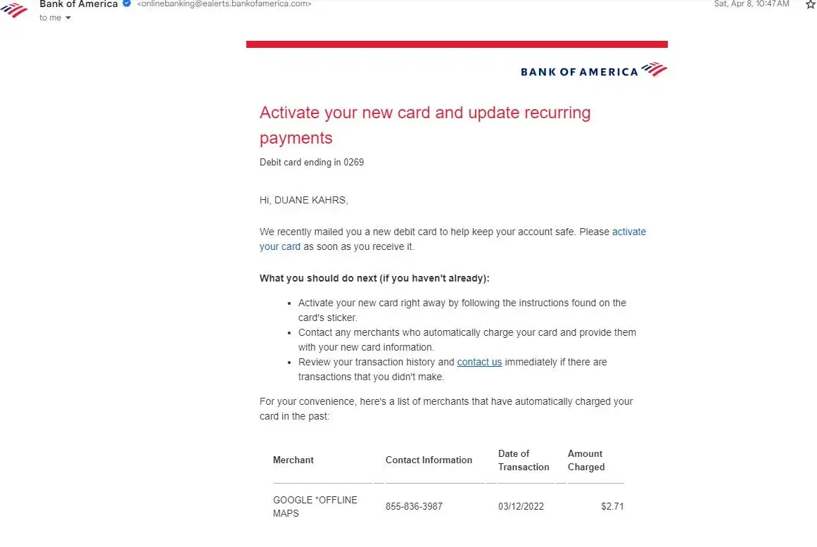 On Saturday June 4th, I receive a text and email alert from Bank of America for fraudulent charges.