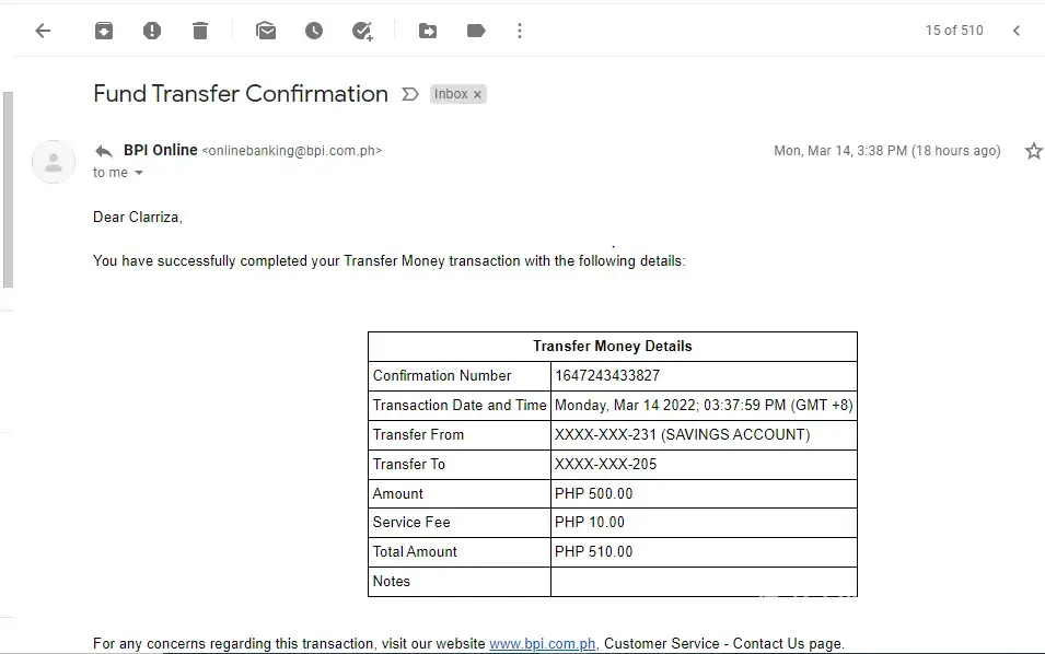 The amount was deducted from my BPI account and an email confirmation was sent confirming the transaction.