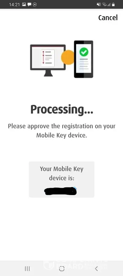 It then proceeded to 3.) get ready with your primary device. You'll be approving your request visa mobile key. Below this notice is the account maintenance and notifications and I am suppose to press 'continue" 4.) then 'processing "please approve the registration on your mobile key device"my mobile key number device is also shown below. 5.)"your mobile key request has expired." please check the attached photos of failed transaction and mobile key registration.