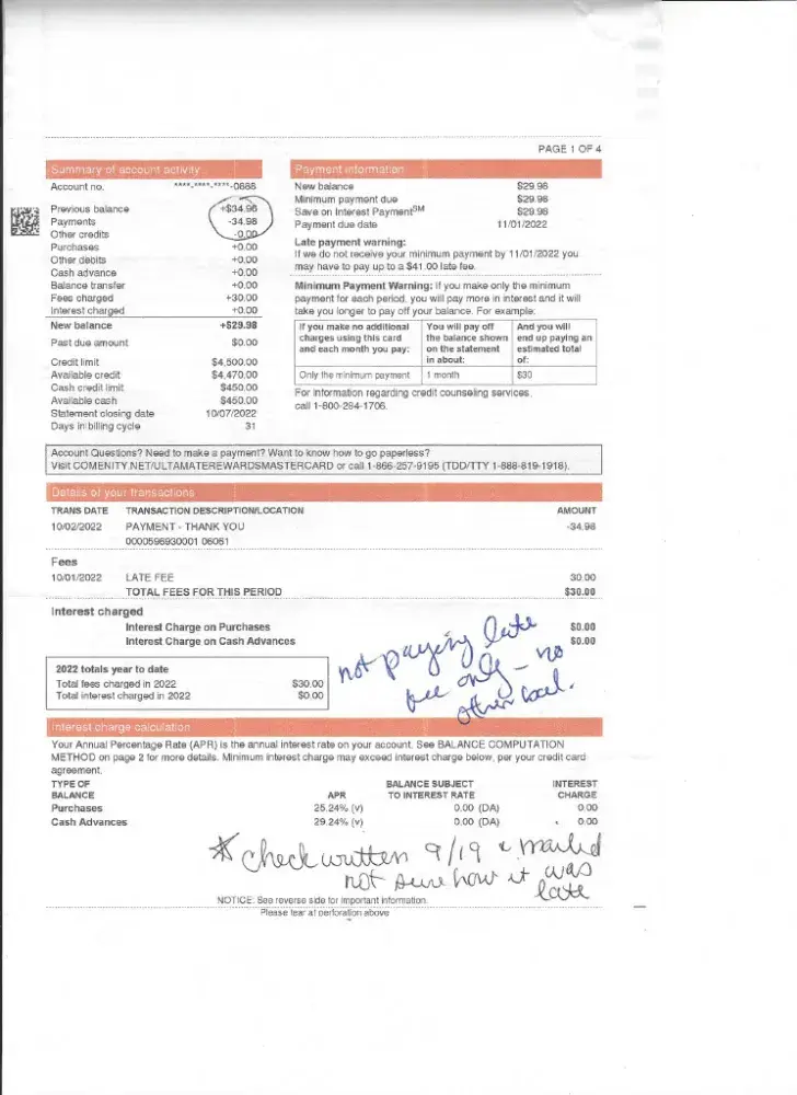 Read full complaintComenity Bank/Ulta Beauty - I would like the late fee and any subsequent fees to be dropped, removed, waived, and for my credit to remain in good standing.