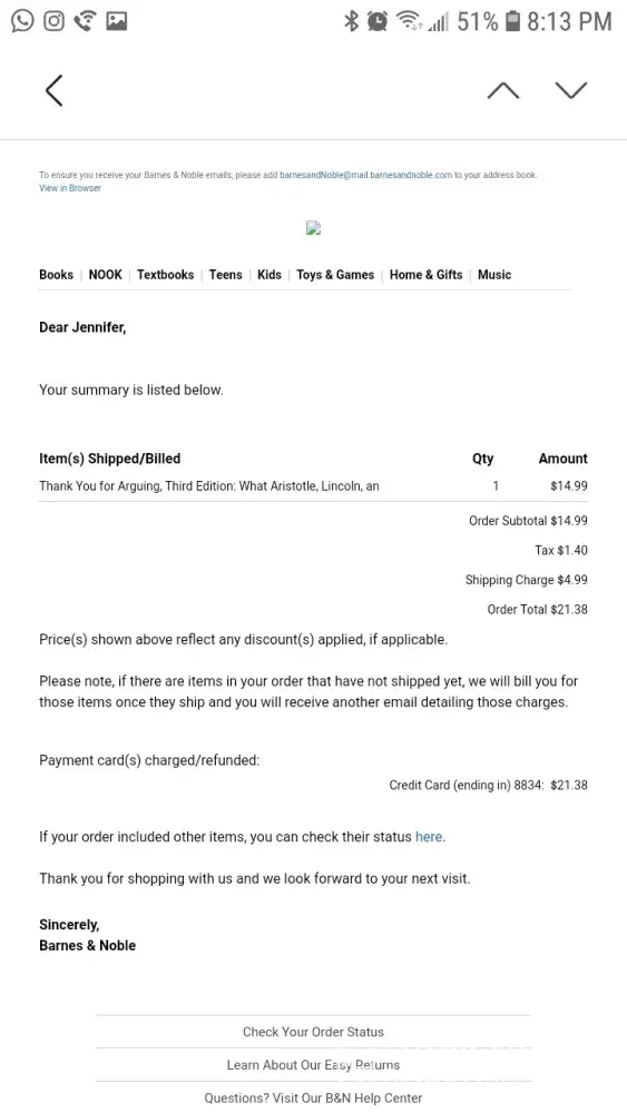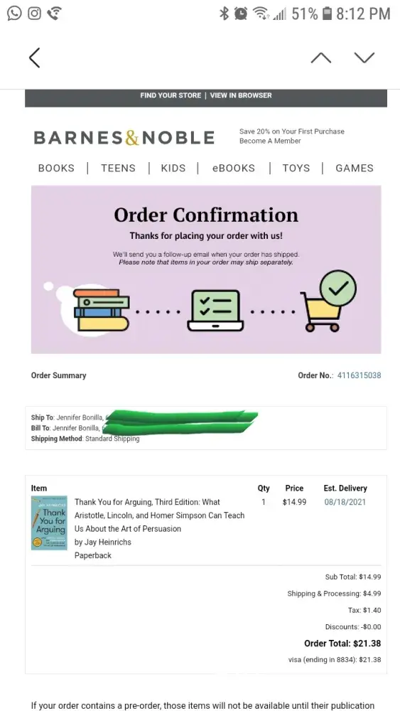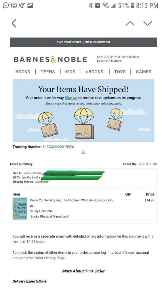 I bought the book, "Thank You for Arguing" by Jay Heinrichs, on August 11, online expecting it to be delivered on the 18th. I received a confirmation email the same day I bought the item confirming that the book was going to be delivered to my address. I then received a shipping confirmation email stating that the book was on its way. On the 13th I got a billing summary confirming that I was charged, and I received my order number. On Tuesday, August 24th I was informed that the item was successfully delivered but I, in fact, did not receive the book.