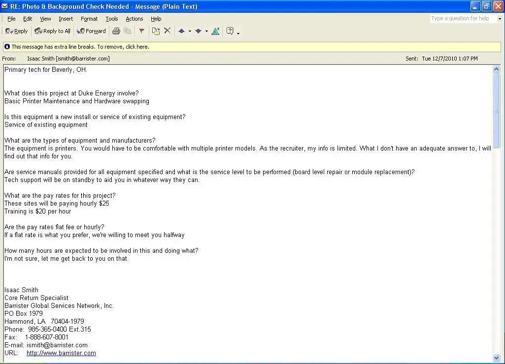 On Saturday, December 6, 2010, I received a call from a person named "Iassic Smith" from "Barrister Global Services". He said that they had multiple customers my area and that they needed a technition for that area to do electronics repairs. I did a search on Barrister International through both Yahoo and Google. I should have known it was a scam when thi...