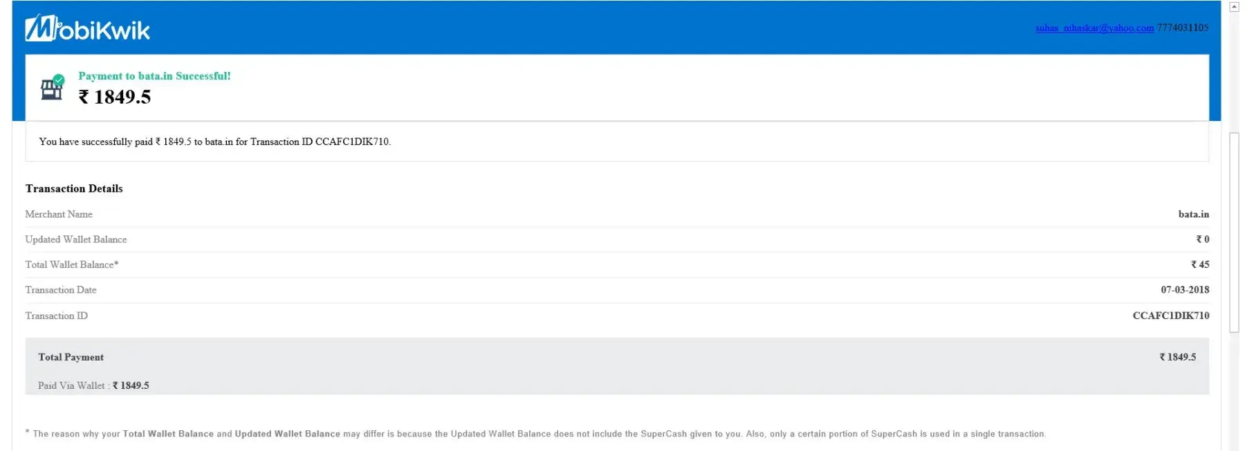 Then I made one complaint with bata, Complaint no: 424399. Now today (30/06/2015) I got one call from Bata saying the order will be cancelled and I should place a new order but the coupon code will not work and I will have to pay extra Rs500/- for your mistake and there is nothing bata will do.
