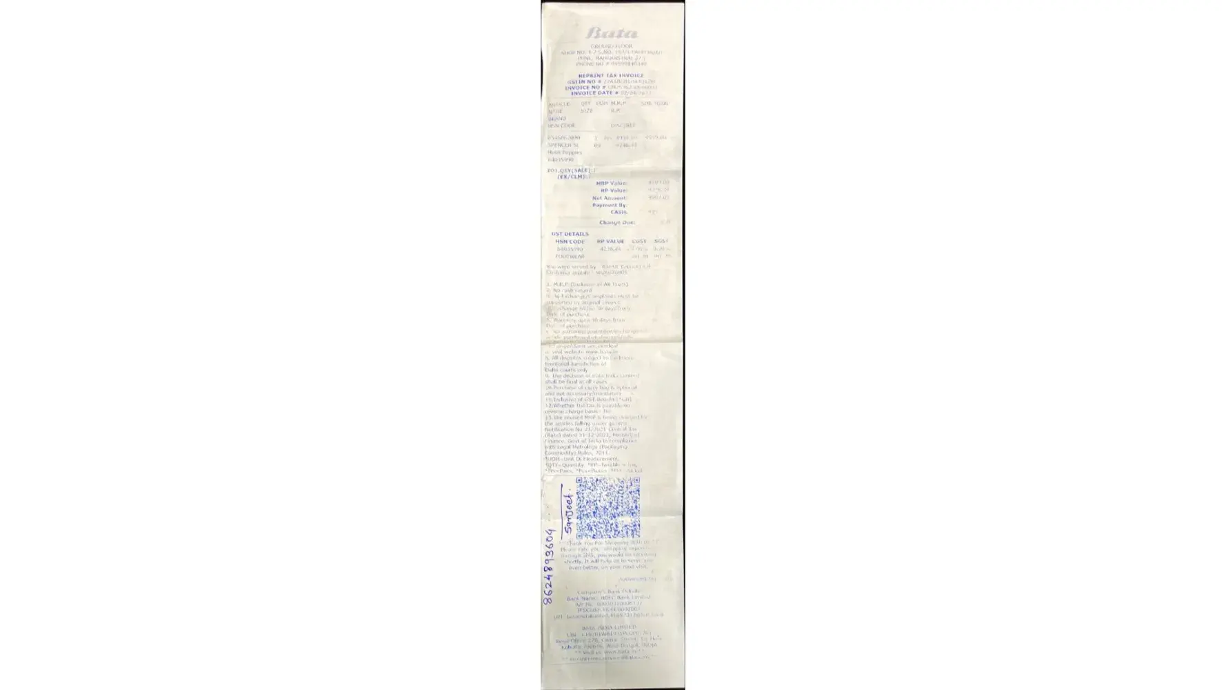 Shoes were brought on 2nd April at Punre Mahrashtra, Within 4 months sole developed crack. Local store could not help and no response from customer care. have attached receipt copy