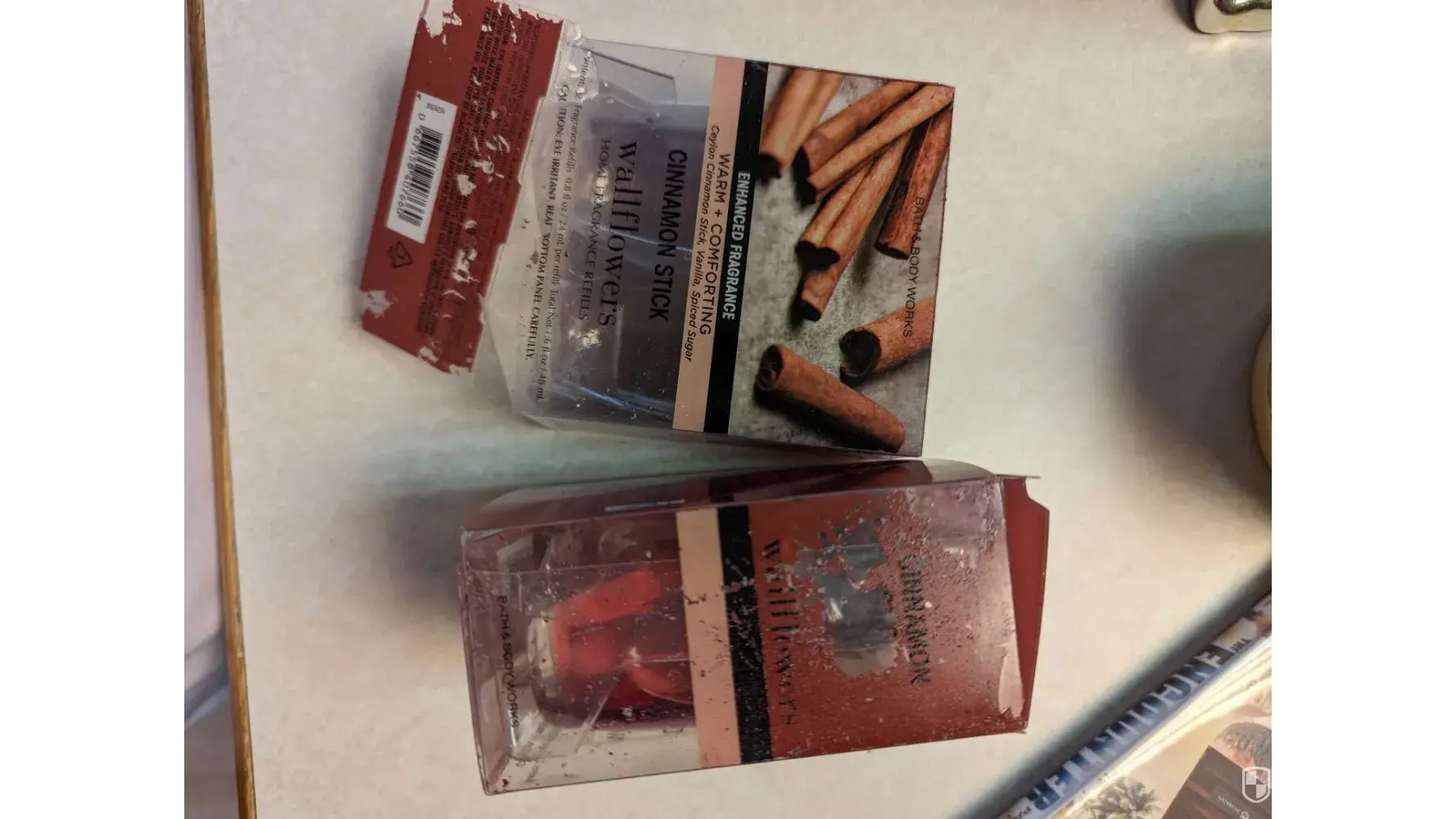 Order #[protected] - both of the product Cinnamon Stick Wallflowers refills were received in damaged condition. The plastic boxes they were in were ripped and torn with product leaking out of refill bottle. The other products I received were fine and the shipping box they came in was fine also and had no apparent damage at all. Looks like the damaged products were damaged before they were put in the shipping box but put in box and shipped anyway. Not impressed with the lack of character and outright spitefulness of person who did that.