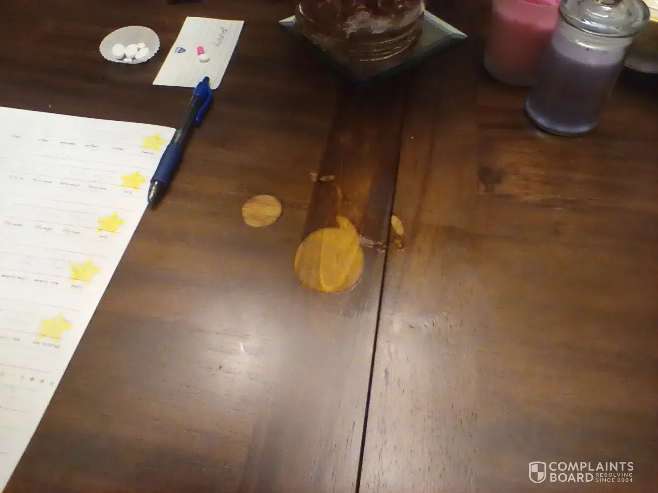Today 71721, I unplugged my Wallflower because it didn't smell, and set it on my brand new table $ 600.0 and it leaked, stripping the varnish off. I am highly upset and want it repaired.