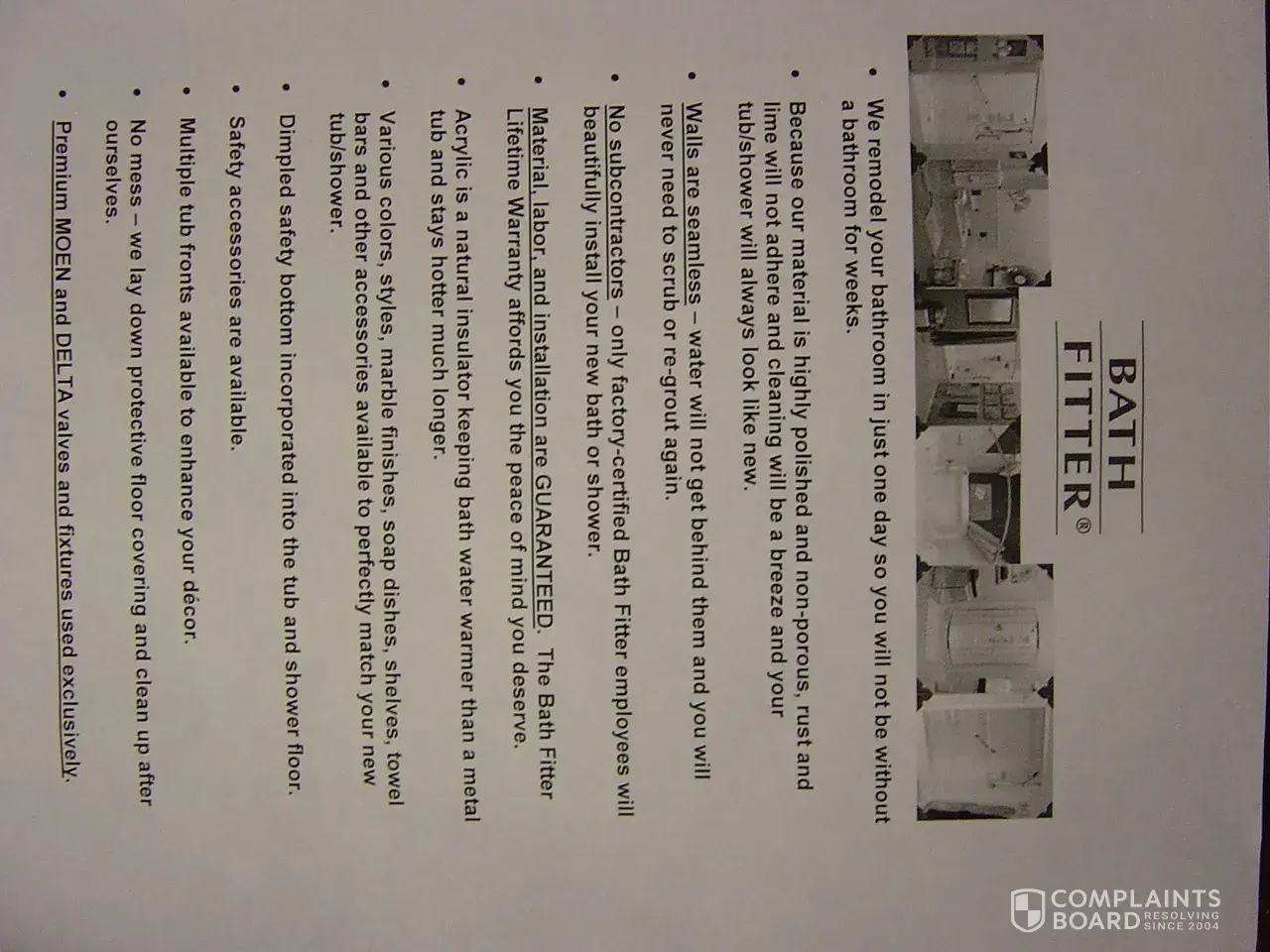 After four trips and several weeks, we were more than a bit disgusted with the lack of customer service and failure to provide services GUARANTEED to us by the sales rep at the first visit. We chose Bath Fitter because of the one-day installation promise and because of the lifetime warranty. However, after what we went through in the first few weeks of trying to get them to properly install an itty bitty shower in our bathroom, why would I ever think they would honor any warranty? They now are billing us for services they failed to complete as promised. Anyone looking at Bath Fitter as an option for installing their bath/shower, be warned!