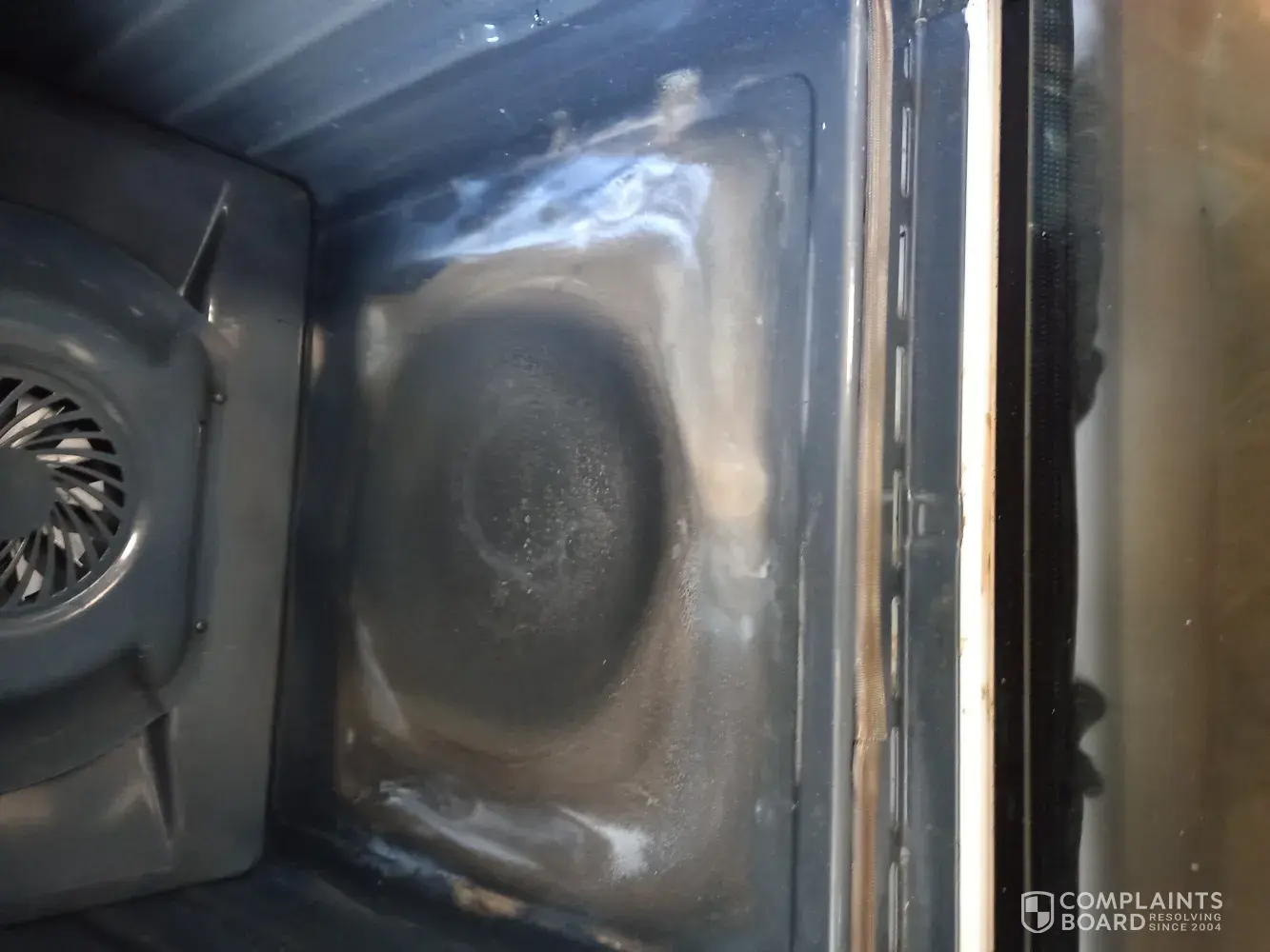 I got a replacement oven in november and paid xtra to get this one I had an engineer out on 2nd june and he says it was cosnetic iv been dealing with domestic n general from then to get it sorted as I pay maintenance they told me to contact youse next step will be citizens advice they engineer asked if I put my grill pan on the base which I do but take it outwhen im cooking theres no where it states not to