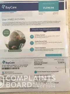 I never agreed to, nor received a bill to our email address. Why weren't we ever billed for this via USPS and why did it take you over 5 months to send a bill stating past due? Meanwhile, I had outpatient testing done months ago and you owe me. I received a text from Bay Care earlier this week saying I had an outstanding balance and when I called was told Bay Care owed me over $50. The testing was done last year as well.