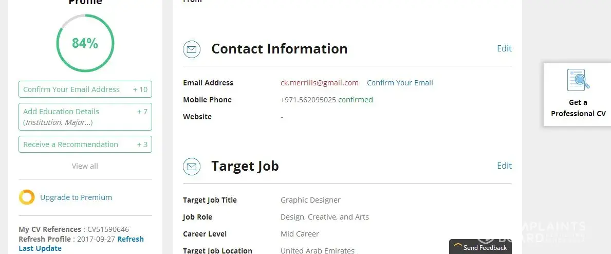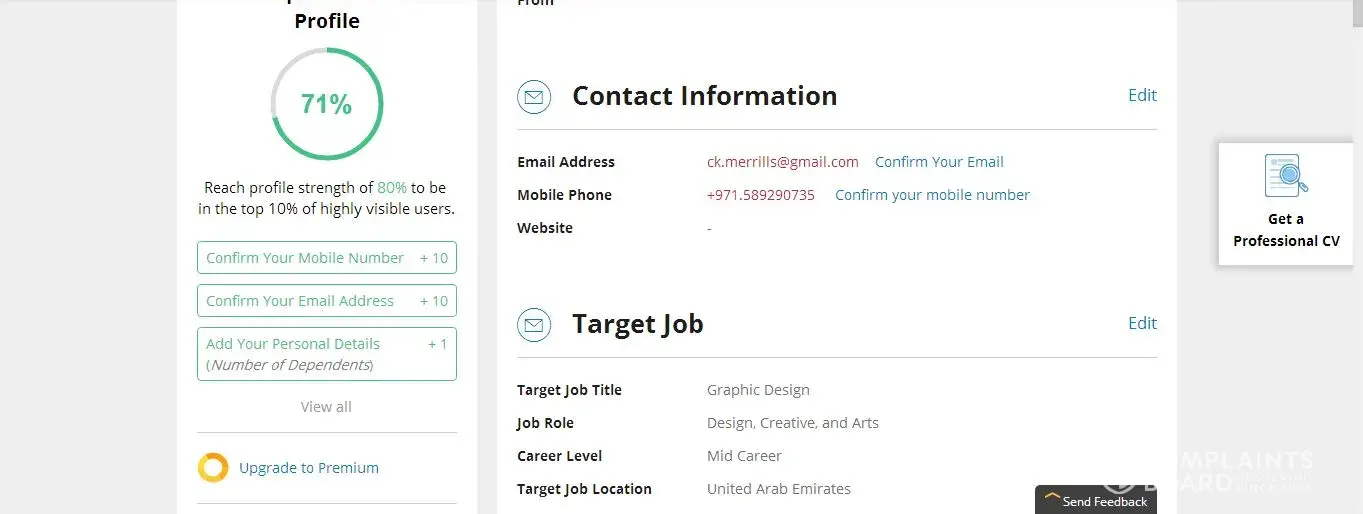 Dear Complaints Board please note that i have clicked on link sent to my mail from you this morning by 5am but there is still no indication of confirmation on my profile as well as my phone number confirmation. please kindly look into this as i may not seem to be able to receive responses on jobs from employers. Please kindly find the attached screen shot as my evidence. Thank you