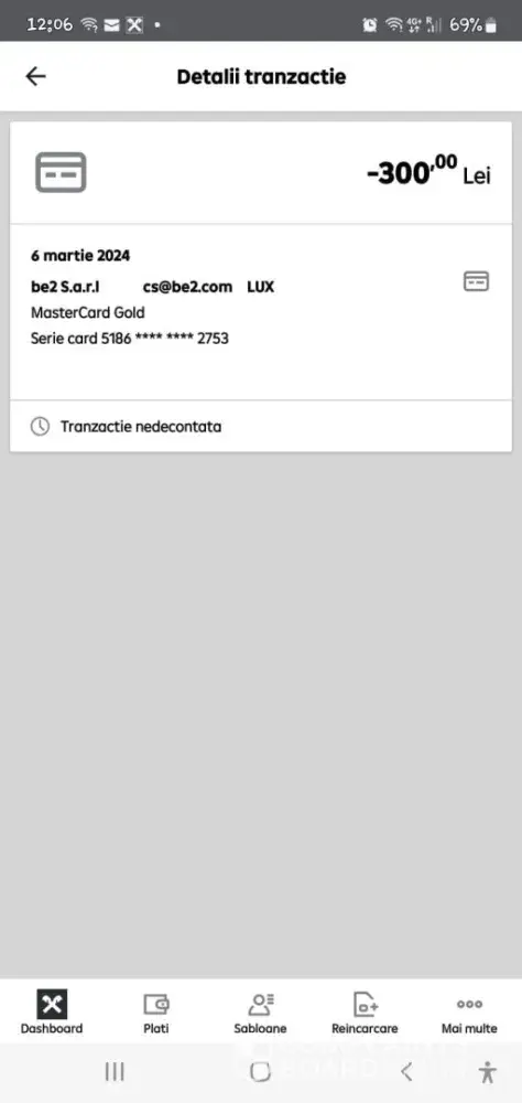 On 06March 2024 I obsered an unauthorised payment for be2S.a. r. l for 300RON.