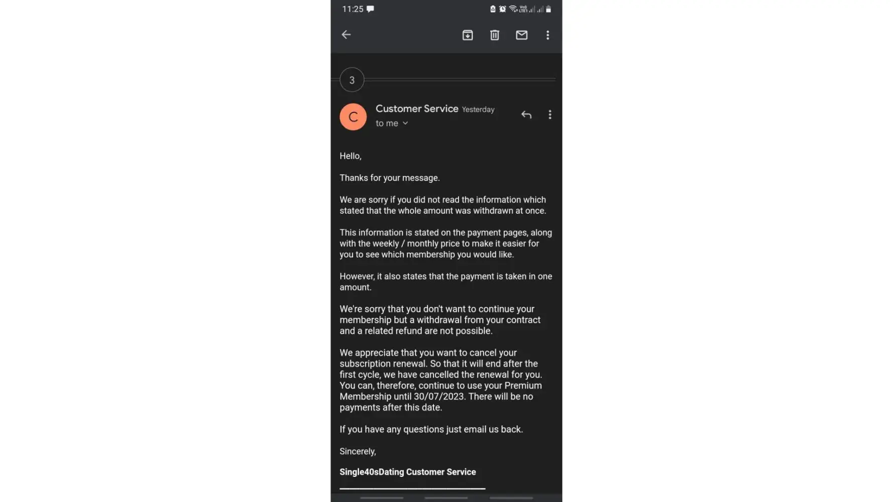 3. I requested that you cancel the membership immediately after this all happened on the 30th of January 2023. I still haven't received a response to my email to this day 07th February 2023. Please attend to my cancelation request email (sent to your customer care email address since your contact form doesn't work) which was sent to you on the 30th of January 2023. Why is it such a problem to cancel a membership I never even subscribed to?