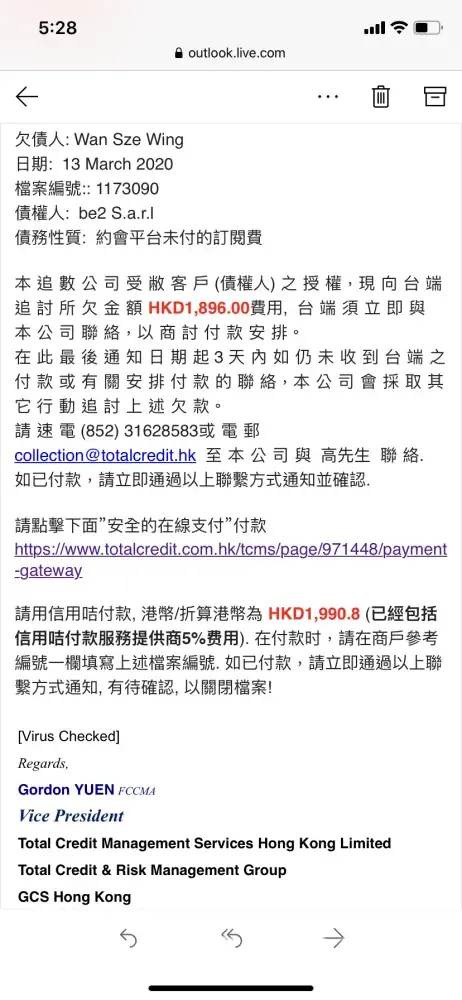 One day later on 27 march, I received letter by my flat address that it is from total credit management services hong kong limited. That mean be2 has sent this third party of my : phone nos, full name and address.