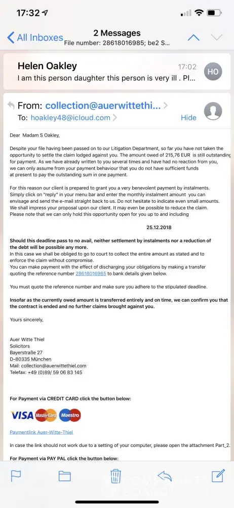 Since I was conned into joining with a tempting low price offer - went from £7 to £191 overnight. They took this unauthorised amount from my account and refused a refund. Blocked any further payments. Marked it as fraudulent with bank. Since then, I've received another bill from an Auer Witte Thiel solicitors for 330 Euros which is almost £100 more than the initial £191 and that I must start paying instalments before 1.10.18.