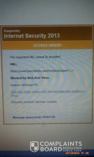 As bad as I wanted to order Hip Hop Abs through Beachbody.com because of it being on sale, my Kaspersky internet security denied the access to checkout. It said that the requested URL could not be provided because it is a phishing URL (http://www.beachbody.com/checkout/upsel). If you don't have Kaspersky as your internet security, I strongly suggest that you all get it. After this happening and reading the complaints on this website, I'm very glad this changed my mind on ordering from this company especially by phone. I'm going to order it from As Seen On TV or Amazon depending on the price. I haven't had any problems with either of theses companies and I've been dealing with them for years. Thank you all for speaking out and having this website for people like me!