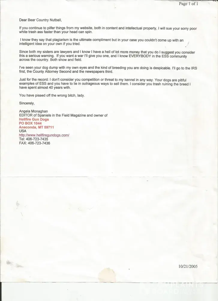 In 1997 I purchased three totally unrelated Springer's locally through out Montana, two females and a male, whom lived to a ripe old age of 14, 15 & 16. They were as healthy and as sweet as can be :) no health problems ever ! At that time I contacted the local English Springer Spaniel Field Trial Association requesting information & asking how to join, I was interested in enrolling my Springer's in AKC field events. I was quickly notified by "whom I believe" to be Angela Monaghan the owner of Hellfiregundogs. I was told I did not qualify to be part of their association because I was a puppy mill with dogs that were not worthy of competing. I believe it was Angela because of the instant unprofessional response. I had 3 dogs? And then the horror/stalking/slander began !
