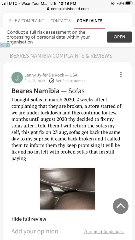 Beares Namibia’s earns a 1.8-star rating from 0 reviews and 5 complaints, showing that the majority of customers are dissatisfied with their furniture and service.