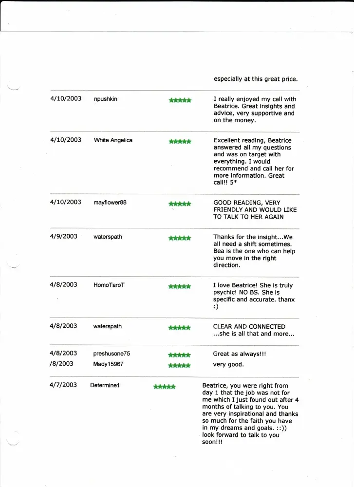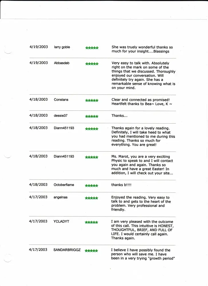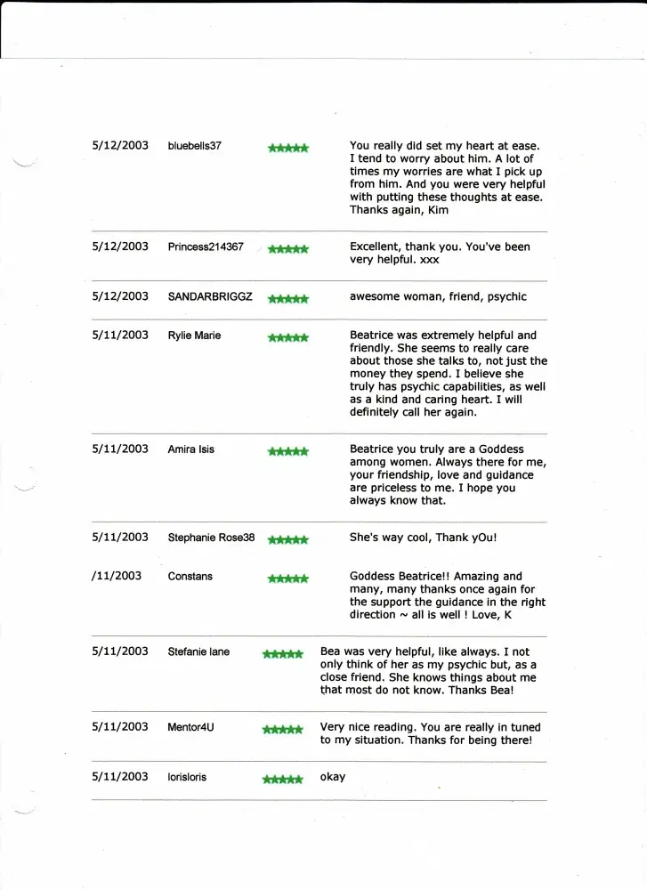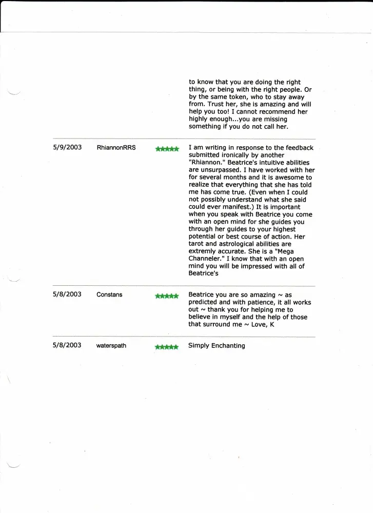This consumer report is to chronicle proof of Beatrice Marot's more than twenty year history of burning innocent, vulnerable people who think she's a real psychic, to prove she's nothing but a mentally deranged cyber bully and cyber stalker, victimizing any one she has a problem with, and she is constantly having some problem wirth some body. For one thing, she isn't really psychic. She learned astrology and tarot card reading so she could do two things, con unsuspecting vulnerable people out of there hard earned money and putting herself in a role of authority and thinks nothing of twisting the truth and using anything you do or say against anyone who stands up to her, declaring war, and will slander and malign them for YEARS. Beatrice has this exact same pattern with every person she has a problem with: She posts publicly anything from petty insults to outrageous lies, and files online consumer complaints about the ones who have businesses slandering them while sending them and their associates harassing, slanderous emails and when they respond or post publicly to defend themselves against the things she's saying about them, she points at that and calls that proof they are actually stalking her. What she is doing is stalking but she's so deeply disturbed I'm not sure she even realizes how crazy it is that she would really think anyone would believe her if they had all the evidence in front of them.