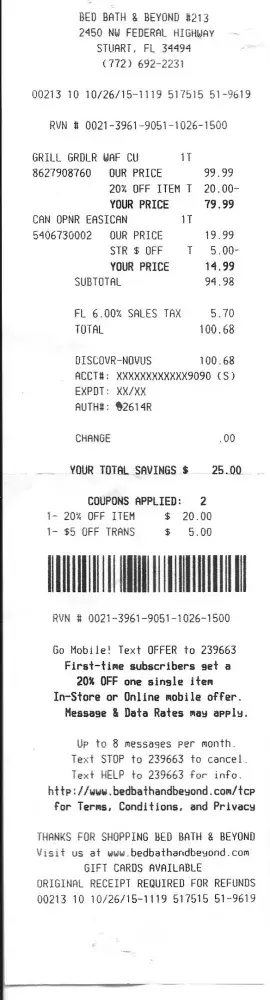 BEWARE OF TEXT OFFERS! They sent me a 20% off coupon in the mail and it said text this code to this number for 20% off one item and you will receive your code to use mobile online so I text the code to the number and get a response --"YOU WILL RECEIVE YOUR CODE IN ONE WEEK" Really? One week ...I'm trying to buy Christmas gifts ...you think I'm going to sit around for a WEEK and wait for a code for 20% off ...hahahaha. So I just went to Amazon and found it cheaper anyway. BOGUS!
