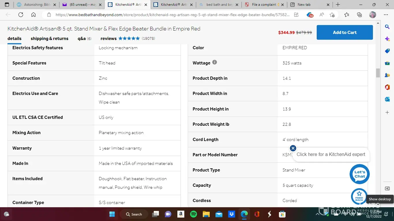 I ordered a KitchenAid 5-quart Artisan stand mixer in contour silver on 11/21/2022. When I received the package on 11/27/2022, via Fed-Ex, the pouring shield, which is included in the product description, was not there. I am very happy with the mixer, but I am frustrated that the pouring shield was not included, as I made quite a mess when I made bread. I called the customer service # your website on 11/28 and spoke to a young man named Amiel in the Philippines, and he gave me a case number: [protected]. I was told I would receive an email confirming shipping info for the pouring shield as it should have been included. I never received an email, so I called the same number again on 12/1 and spoke to Raven (in another foreign country), who told me the package would be delivered. She stated I would receive an email within 24-72 hrs., and at this point I have not seen an email indicating I would receive the item. I then called the Augusta Maine BB&B store and the manager there, Cornelius, told me that often it is of no use to call that number, and he told me to call KitchenAid to request the item. I have not been able to get through to them either. This is very poor customer service, and I am very close to filing a formal complaint with the New Jersey Better Business Bureau about how badly my case has been handled. I would appreciate a prompt response on this matter, as I would like to use this mixer for the holidays. Below I have included a screen shot of the description of the included items for this bundle which lists the pouring shield.