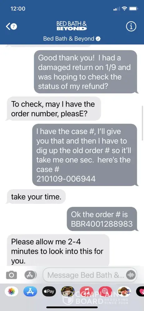 After waiting 3 weeks for the refund, I contacted BB&B customer service and was told to wait another week. I contacted BB&B again on 2/6 for another status and after explaining the situation again, I was told the refund would be processed right away and a credit would be applied to my credit card within 2-3 days. Attached are copies of that chat history.