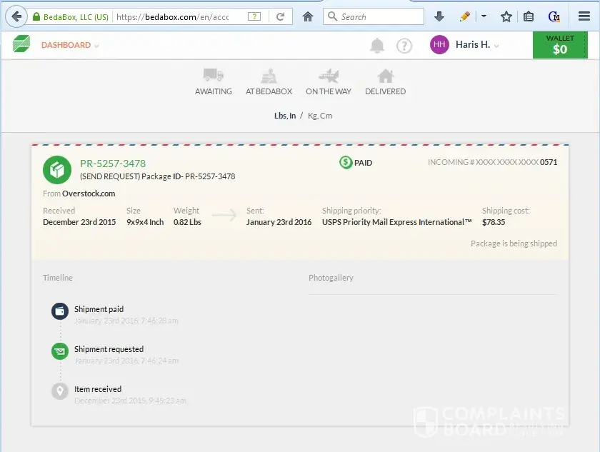 i sign up account at bedabox forwading company on dec, 2 2016. account number US16SA0024.