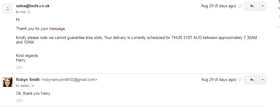 I would like to complain about the service I have received from beds.co.uk regarding the handing of my bed frame and mattress. I ordered both of these on the 23rd August and called to specify that I cannot receive the items until the 11th Aug or after as the 11th is the date I will be moving into the property. The lady on the phone assured me that I will not receive the bed until after move in date and I will be contacted to arrange a suitable delivery date.
