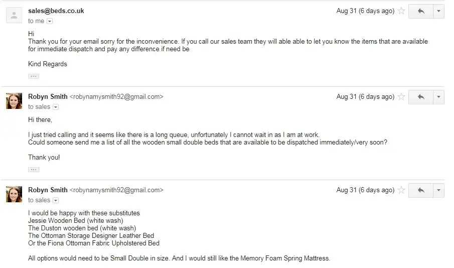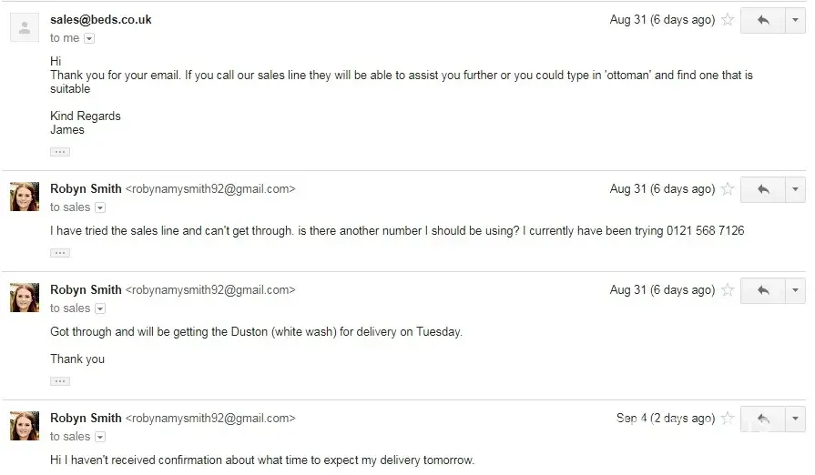 At this point I was offered 10 pounds for the inconvenience and to change the bed order so that I would be able to receive delivery sooner. I agreed to this and gave them a list of the beds that I would consider taking.