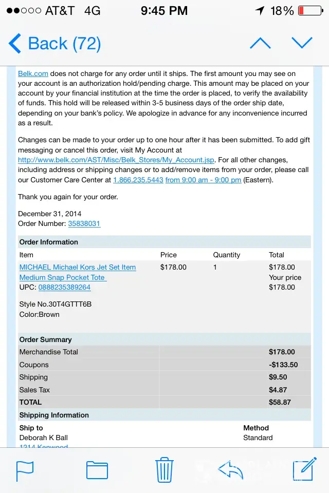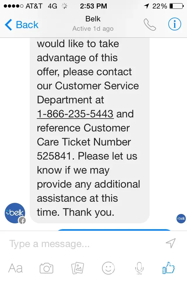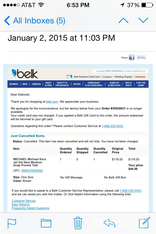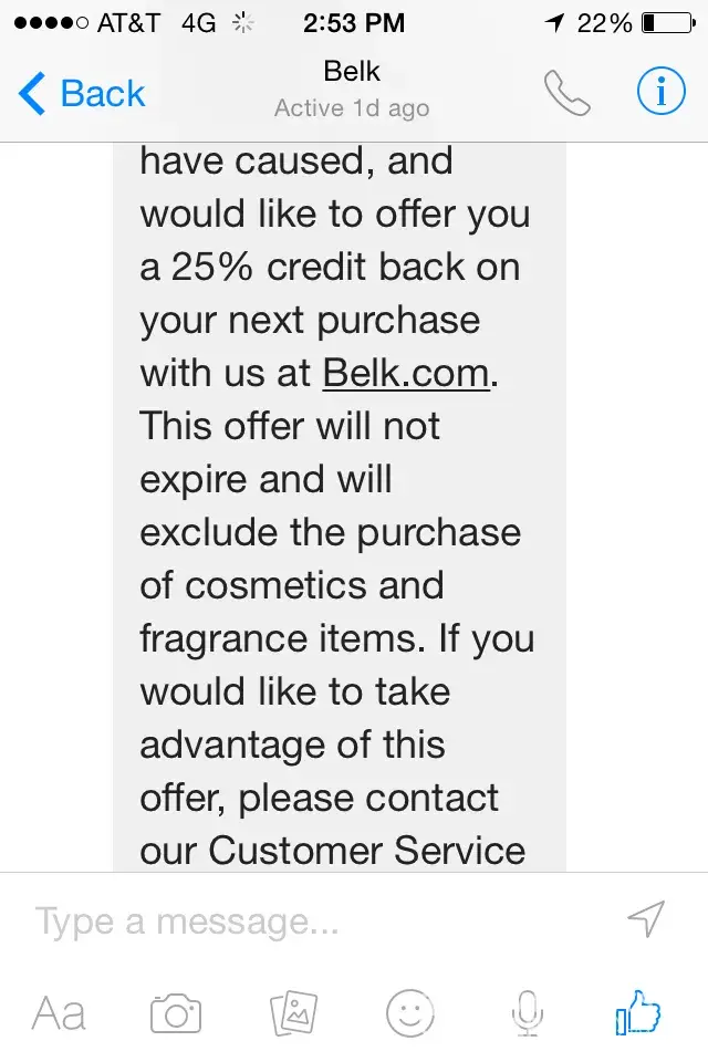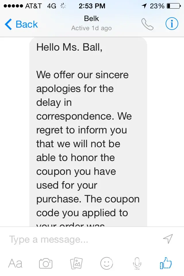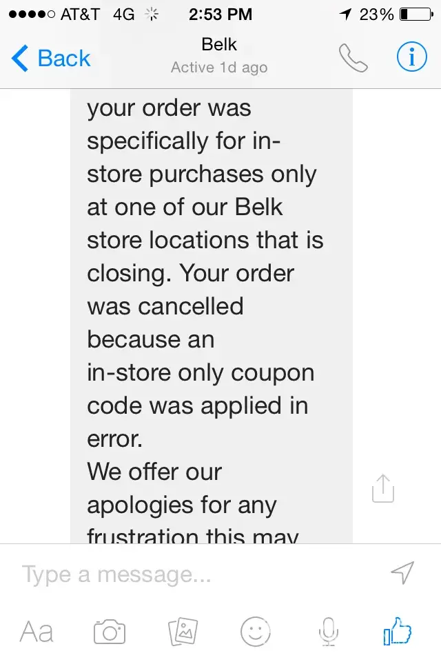 Next day I get an email from my credit card saying that belk tried to charge me $112 but it was declined due to insufficient funds on my card.