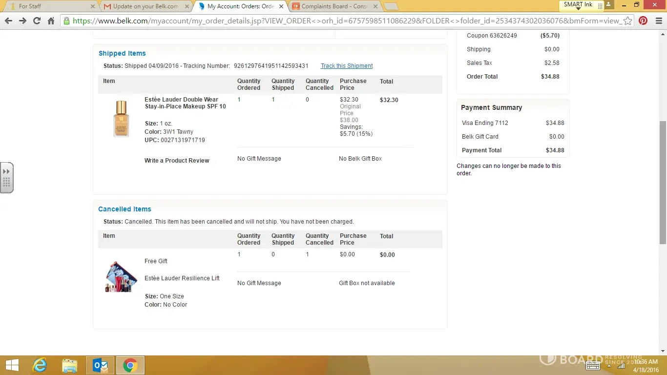 I am very unhappy with a recent order and the attempts to resolve this issue. I ordered a foundation during a promotional event in which I was to receive a free gift with purchase. I was within the limits of the promotion and received the foundation I ordered at a price of $34.88 total. The foundation arrived quickly and my card was charged the amount. However, no promotional item. No explanation. I waited a week thinking they would ship the promised item when it became available. Upon checking on the item I found that they were "out of" the promotional item and it had been "cancelled"! No rain check, no voucher, no apology. I called to ask if they could send a voucher so that I could take it to a local makeup counter that sold estee lauder and pick up the promo item locally. The customer service rep did not have that authority. Bottom line: I think it is dishonest to knowingly charge a customer and send a product without notifying them that the promo item is cancelled and won't be arriving nor replaced! It is a tactic to get your $ up front and then not provide what was expected. Estee lauder runs these promos to get people to order their product-which is the exact reason I waited to order my make up from belk. I should have been told the promo item wasn't available and given the opportunity to cancel the order! They knew they didn't have it when my card was charged. If this isn't resolved I can choose to order all makeup from another retailer such as dillard's profitts or similar. I will not make any clothing purchases or otherwise at belk, either. This is such a small issue that they could easily remedy-i find it ridiculous that I even have to jump through these hoops when they could settle this so easily.