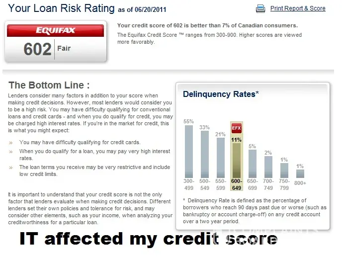 I paid $23.95 to check Equifax for my credit score. My score did go down from my previous very good standing to fair standing. It's troubling me that I have to pay to check a PROBLEM THAT BELL CANADA had mistakenly done. I will keep all receipts and deductables that will cause me to spend extra on this case with Bell Canada.