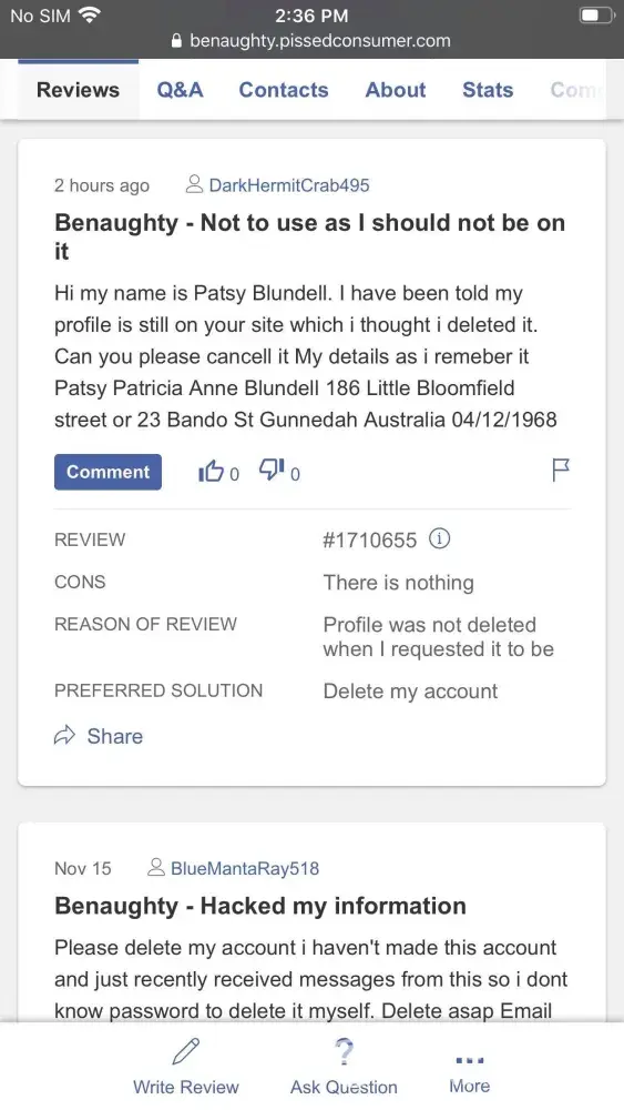 Salve, sono un ragazzo di 36 anni che stupidamente è caduto nella truffa di benaughty. Mi sono iscritto, ho sottoscritto l'abbonamento e poco dopo aver capito l'inesistenza di donne nel sito ho deciso di cancellarmi senza riuscirci. Inoltre cosa fondamentale non riesco a disdire l'abbonamento sottoscritto chiedendomi un codice di cancellazione che non ho mai ricevuto. Un call center non esiste, l'help desk non risponde alle domande in maniera esaustiva e così non riesco piu a uscirne da questa situazione. Potete aiutarmi?
