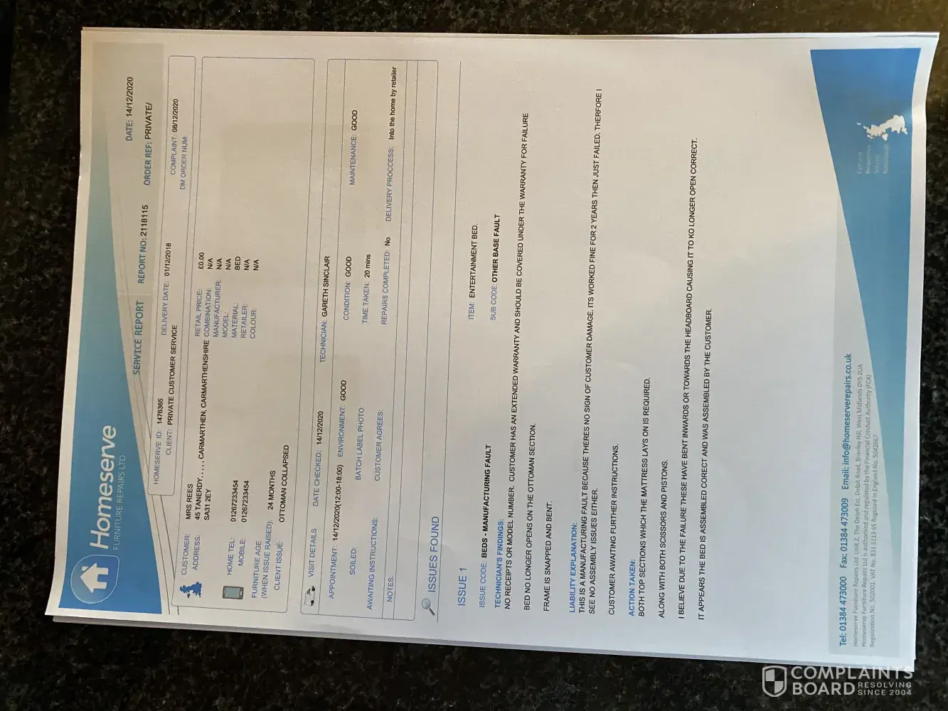 The Bed I purchased from you broke in November last year. You sent an engineer out to inspect it (I've attached photos of the Engineers report)