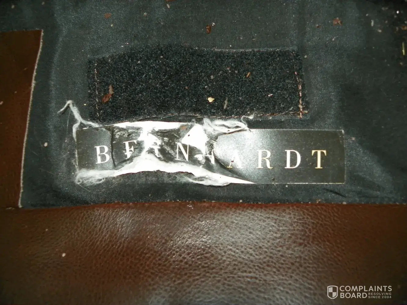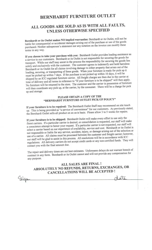 In November of 2006 I bought a Bernhardt couch from the Bernhardt Outlet store while visiting Hickory, NC. Within several months of buying the couch, the leather started flaking off. This seemed extremely strange since we have never had a cat, dog, or other animal. Now it is about 7.5 years later and the couch is horrible looking, even though we have never had any animal in the house. We have had a cover on our couch over the last couple of years since it is such a mess. The flakes of material on the couch get all over our house and we literally have to sweep or vacuum around the couch every day. As you can see from the pictures, the couch is in horrible shape. Today I realized there is a hole in the material as well. I will NEVER buy any piece of Bernhardt Furniture again. The quality of our Bernhardt couch is unacceptable and I wasted a lot of money on this purchase ($835 to be exact plus a hefty shipping fee). I called the Bernhardt outlet in Hickory and was able to get copies of the receipt from them. They also sent me my "Terms and Conditions" file copy which I NEVER SIGNED! (Pic of unsigned document is attached).