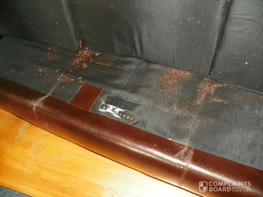 If I had not bought the couch "as-is" I would have immediately contacted Bernhardt to notify them of the problem. I know there are no guarantees when you buy an item "as is" but I feel that Bernhardt should have been up front with me and told me that the issue with this couch was related to the quality of the actual material. They knew there was or could likely be an issue and did not tell me. I assumed that the couch was on sale since there was a minor scratch or since the bottom of one of the couch legs looked slightly different than the others. Little did I know the couch would become a major health hazard. I have two small children and am constantly worried about my children putting the couch pieces in their mouth or accidentally ingesting them while on the couch. The couch is also a terrible eye-sore. Additionally, we have to sweep around the couch at least twice a day and have done this for years. Once the couch developed a rip in it on the cushion (the rip is currently several inches long and is shown in one of the photos) I felt compelled to contact Bernhardt Customer Service. It is unethical for a company to not share information it has on their products, especially if a product is damaged in some way that the customer does not know of if the product could cause a serious health issue. After numerous emails back and forth with Bernhardt Customer Service, they have offered me a discount on SHIPPING ONLY of a new couch IF it is shipped to a location in NC, and IF I am willing to purchase another terrible quality from the outlet which I will most definitely never do.