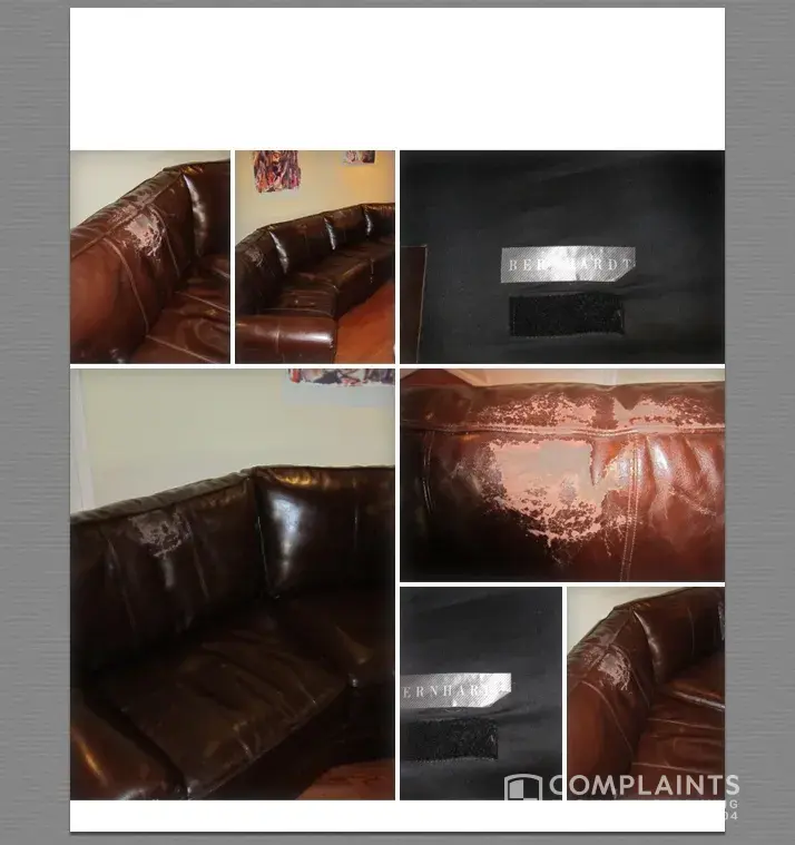 I purchased a beautiful Bernhardt leather sectional sofa from a couple that lived in a town an hour away from me. The sectional was three years old and when I bought it, it was gorgeous. It is indeed Bernhardt because I checked and did my due diligance before purchasing this. I still paid $700 for this three year old sofa knowing I was paying for the name. Im a single mom so that's still an expense fo rme. Within 2 months my sofa started peeling slowly and now four of my cushions are utterly disgusting! i can't even sit on them without the leather pieces comign off on our clothes and skin. Underneath the peeling is still leather. I saw the invoice and receipt of the lady's purchase of this and it was from Weirs and was indeed Bernhardt. I can no longer find their phone number and I guess their gain was my loss. But Weirs carries this exact sofa and it's 4k. This sHould not be happening. utterly ridiculous workmanship!