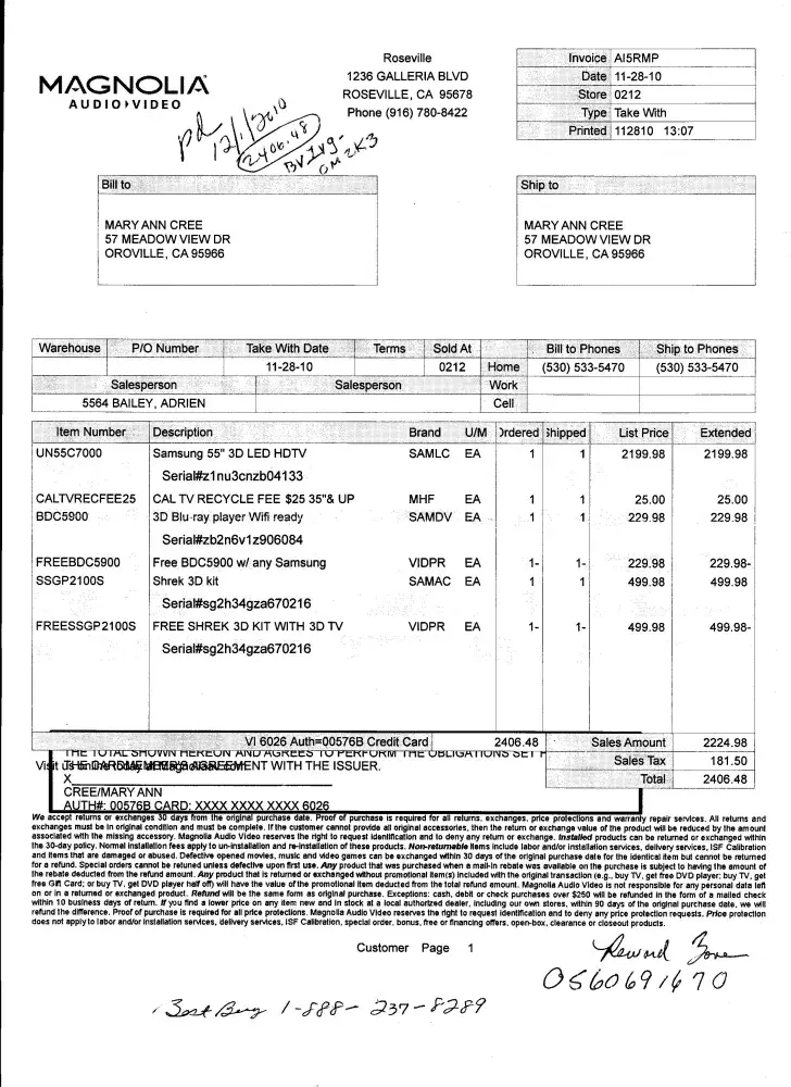 11-29-2010 I went to Roseville store to buy TV I found the TV I wanted on display in Best Buy store. Salesman guided me to another section of store (not a separate store) to ring up purchase. It cost $2406.48. My reciept says Magnolia Adio/video. I never heard of Magnolia and questioned salesman, he said Magnolia and Best Buy were partners. I asked about my...