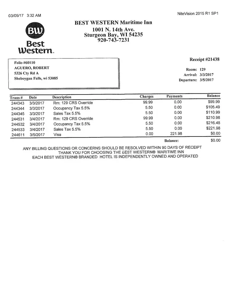 My fiancé and I spent the weekend at the Best Western Maritime Inn in Sturgeon Bay, Wi on 3/3/17-3/4/17 room 129. We made a complaint that an adult had blew her nose in the pool along side her significant other of which did or said nothing. We brought this very gross, inconsiderate behavior to a staff employee asking if the pool could get evacuated to be shocked, she stated "No", I'm like really! Now mind you this is at between 9-10pm the pool closes at 11pm; the employee says "you can leave". Where were we suppose to find another motel at this time on a Friday night, not to mention most motels in the area were booked for the weekend (kids sports, etc.)? The hot tub jets were also not working at all over the weekend, this should have been posted on their website. We booked and paid extra for these amenities of which neither did we use due to the reasons explained above.