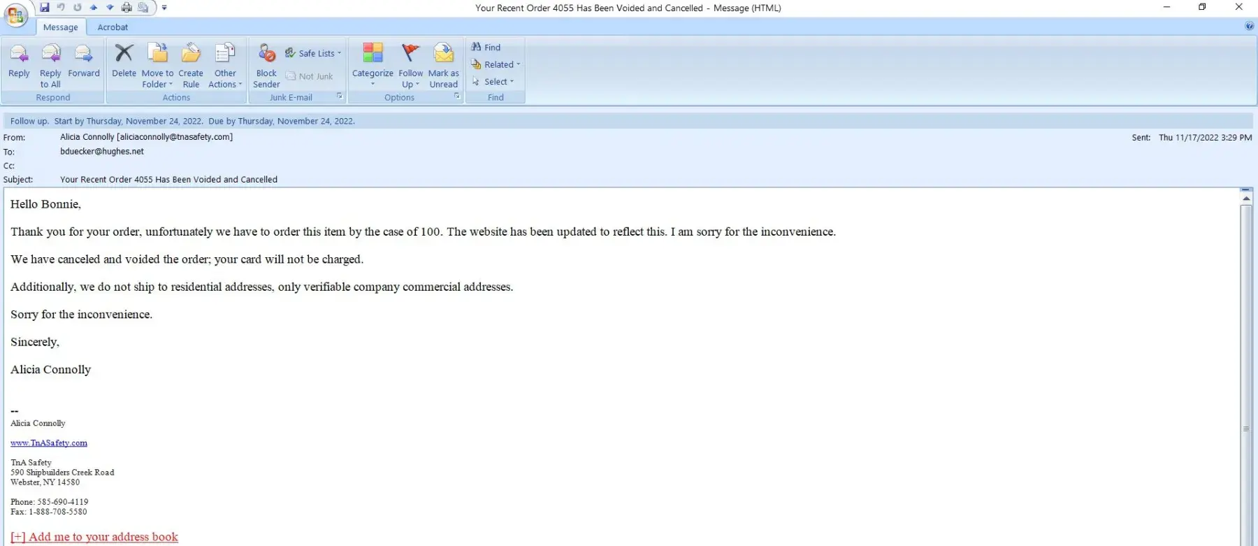 On November 17, 2022 I tried to place an online order with tnasafety.com, first with a debit, then with a credit card. They accepted the credit card order, then emailed me that order could not be completed. The next day both cards had fraudulent charges for a dark web site!