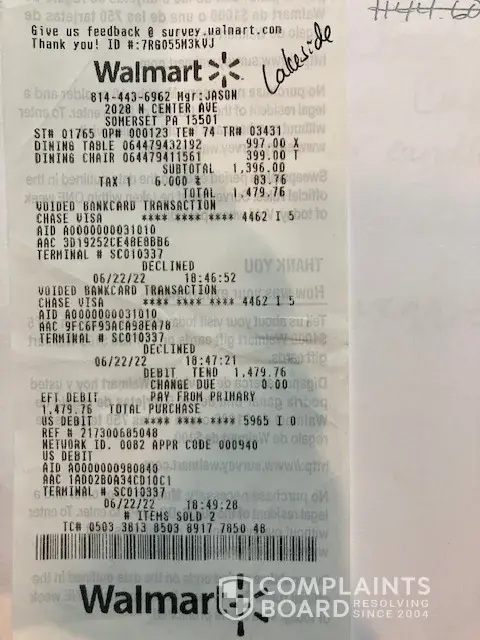Purchased the chair June 22, 2022 from Walmart in Somerset, Pa