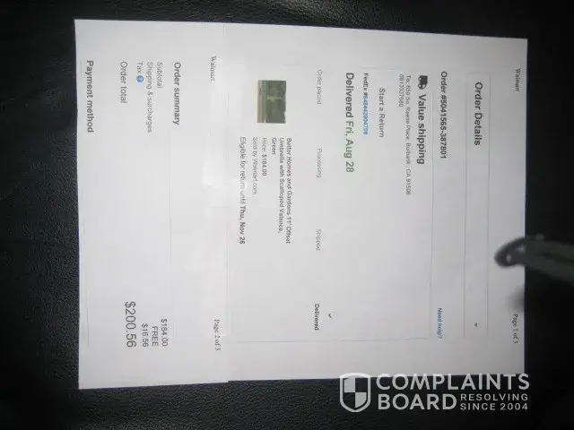 I purchased a Better Homes and Gardens offset umbrella from Walgrens which was delivered 8/28/2015. While setting it up we discovered the pole was bent the wrong way, forward rather than backward, causing it to be too low to the ground. This was apparently a manufacturing defect. I am 5'6" and could not walk under it. I called customer service and spoke to a representative named Daniel and sent him e-mail pictures of the umbrella. He said they would send a replacement pole. 9/30/2015 I called Daniel again as I had not received the pole. He said there was a delay but the pole would ship in 2 days. 10/30/2015 still no pole. I called and got a different chap as Daniel was not at work. This chap said they were on back order. Called 11/9/2015 and spoke to Daniel. He said I should return it to Walgrens. Why didn't he tell me that 2 1/2 months ago? I relied on the Better Homes and Gardens instructions and customer service representative Daniel. How am I suppose to return an item with no box? And by the way...summer is over.