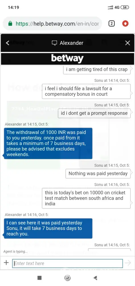 Hello Betway my withdrawal amount 54300 rupees 45 days over but my money not credit your Betway team iam daily Costmer support sending msg but your Betway team no response me sir plzzz credit my money