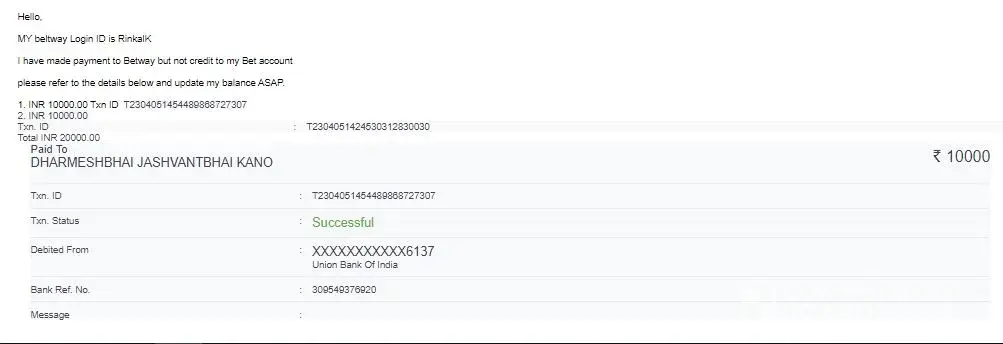 I am writing this email to express my extreme dissatisfaction with Betway's non-crediting of my deposited amount of INR 3500. I am a new customer of Betway, and this was my first deposit, which was made using the UPI method. The transaction was successful, and the amount was debited from my bank account. However, to my surprise, the amount was not credited to my Betway sports account, despite the confirmation of the successful transaction.