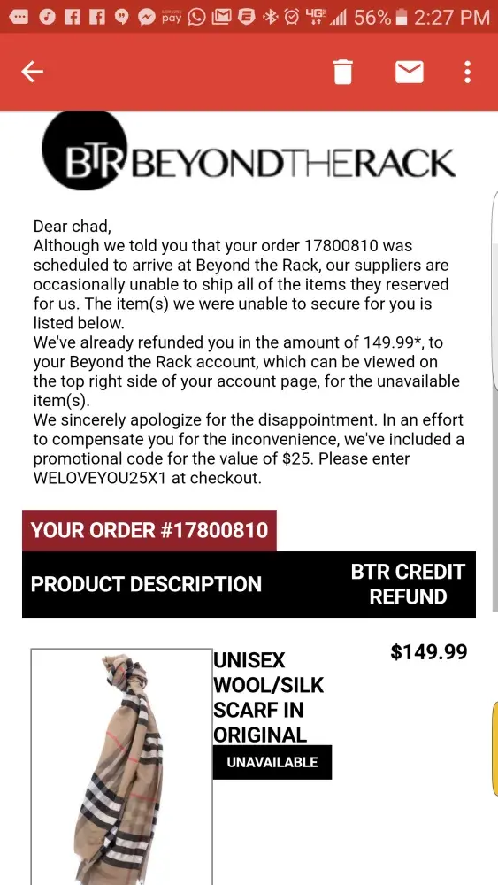 I will no longer support any transactions through "Beyond The Rack" now called BTR... An order that I placed back in May that I asked them to cancel in July since I hadn't received the order, received an email stating that they will cancel and refund in BTR Credits. All but 3 items suddenly showed up in the mail at the end of July. I called today to try to find out where my "Item Refunded" amount went to... They told me they can't refund or issue credits since they are no longer Beyond The Rack and are now BTR! ARE YOU F'N KIDDING ME? I have in writing where they state that they will issue credits... They just stole money from me! Their solution is for me to go to PayPal and start a claim!