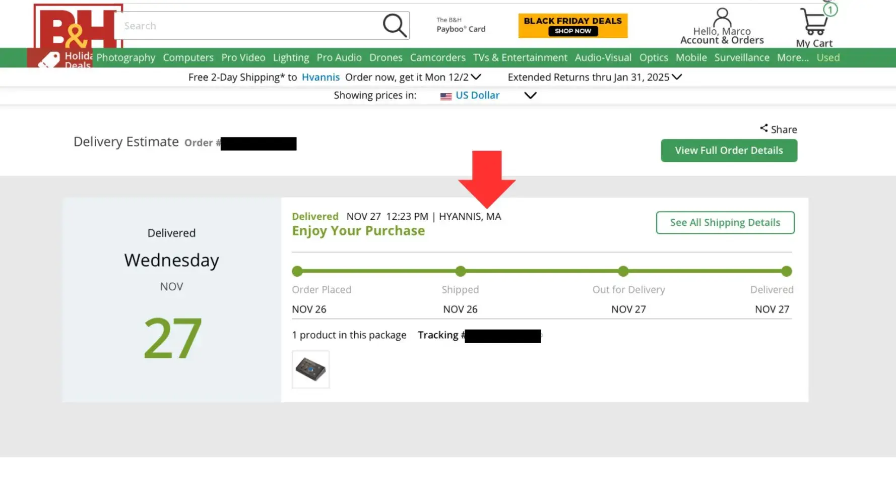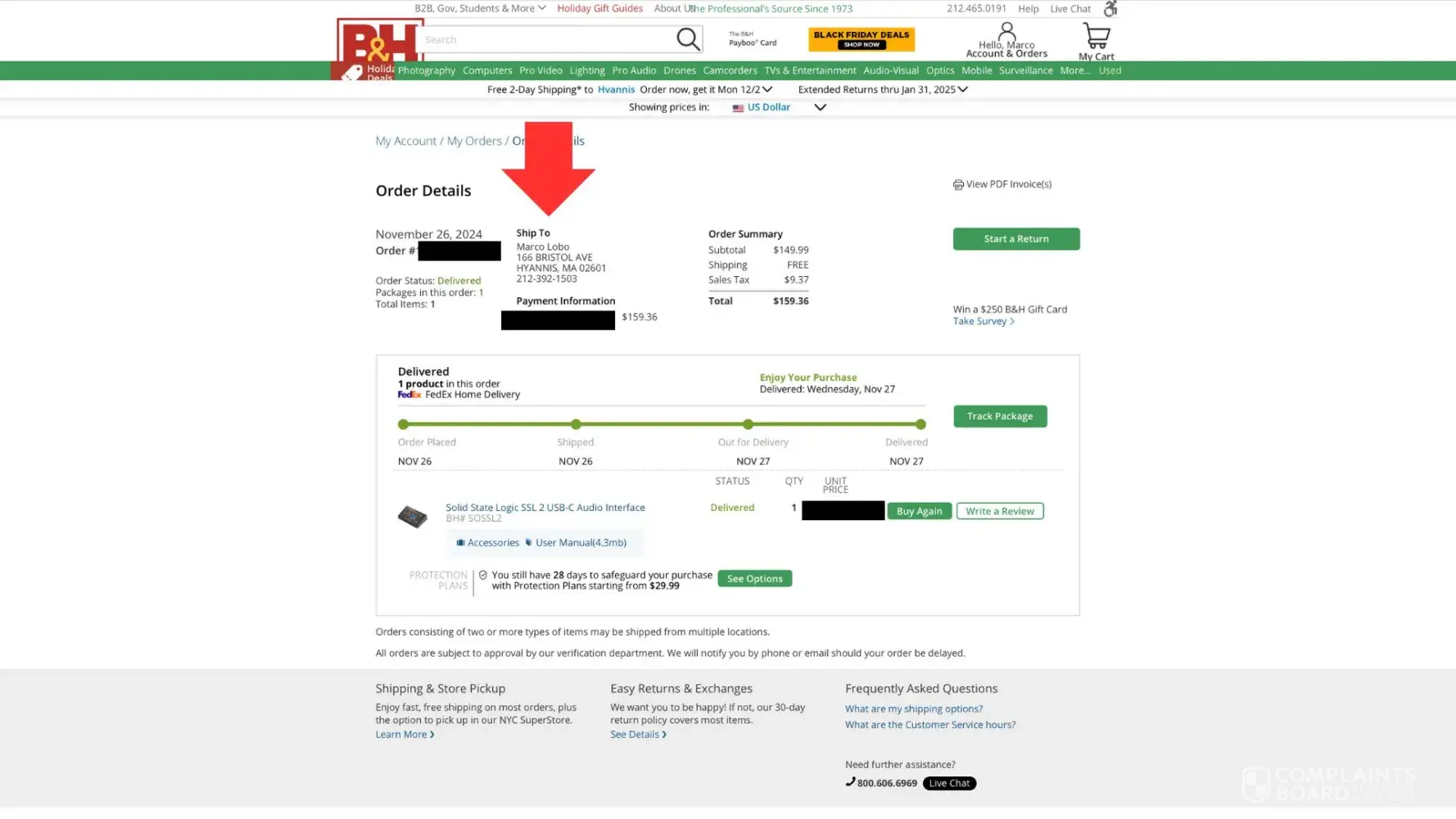 My name is Marco, I’m from Brazil, and I made an international purchase on the B&H website on 11/26/24, with a delivery scheduled for 11/27/24. I work in content creation and recording for the internet, and I purchased an SSL2 interface. The delivery address was in Kissimmee, FL. This order was to be brought to me by a friend. I tracked the delivery on the B&H website, and the package arrived on 11/27/24. I contacted my friend to confirm if everything was correct. To my surprise, the product didn’t arrive. I checked the FedEx website and saw that the package had been sent to 166 Bristol Ave, Hyannis, MA, 02601, [protected].