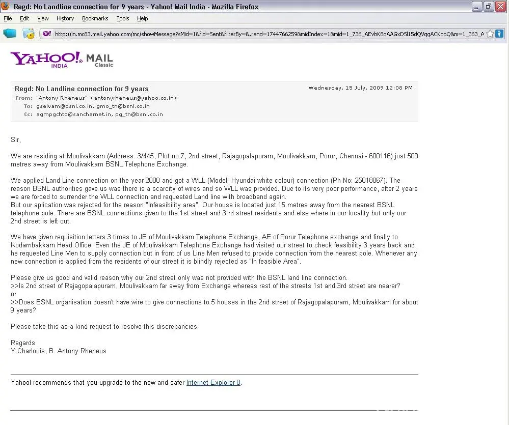 The below is the complaint sent to CMD of BSNL on 10th of October 2009. This regarding about basic things like regarding restoring of landline service which is "DEAD"