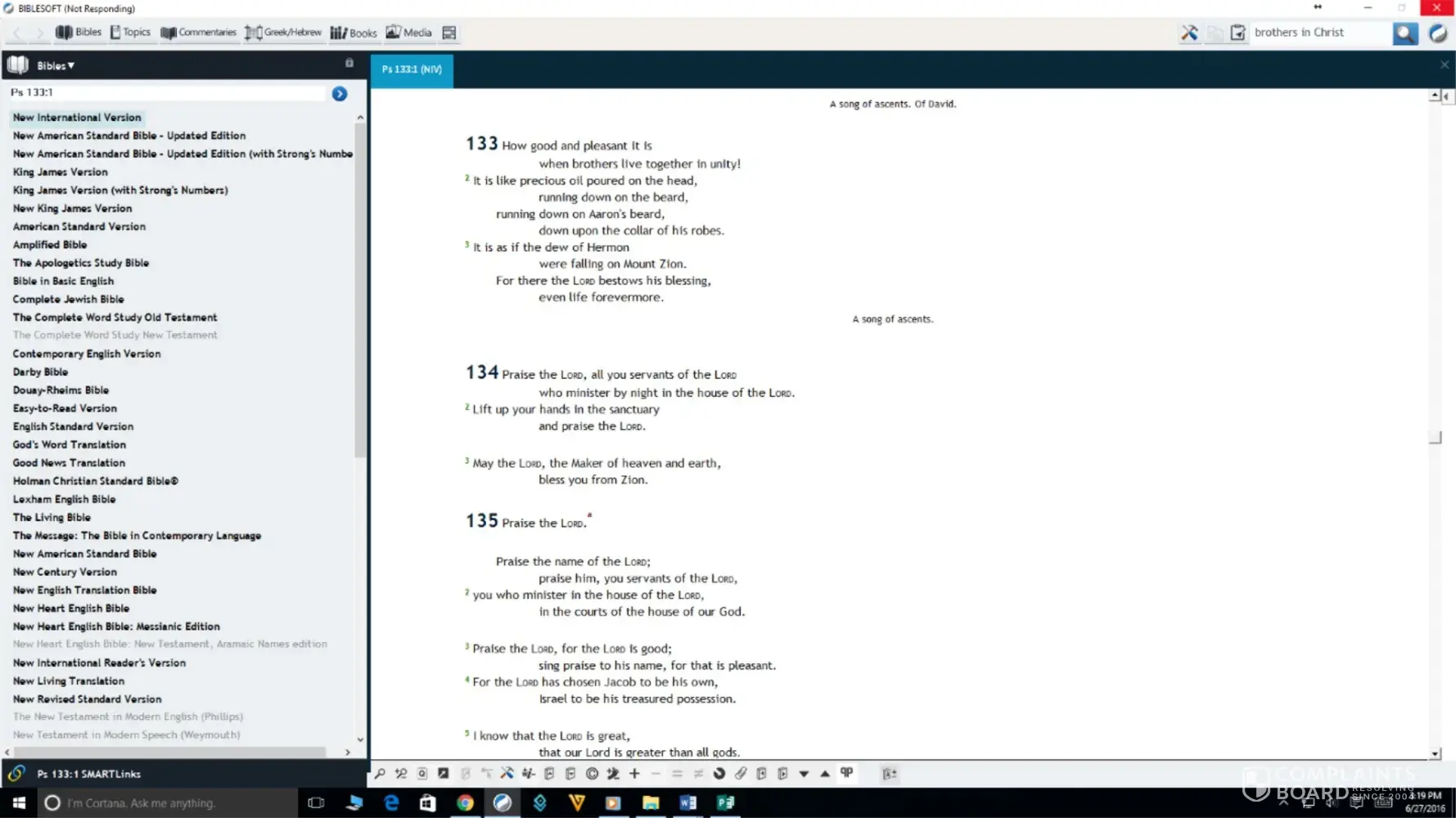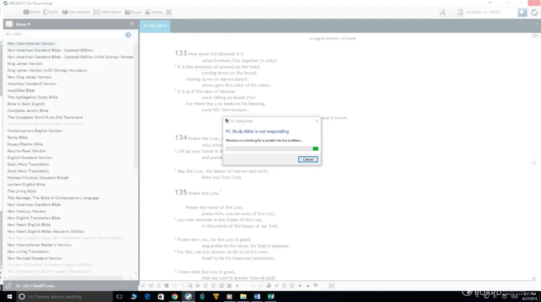 After loading, it gave the message "pc study bible has stopped working. A problem caused the program to stop working correctly. Windows will close the program and notify you if a solution is available."