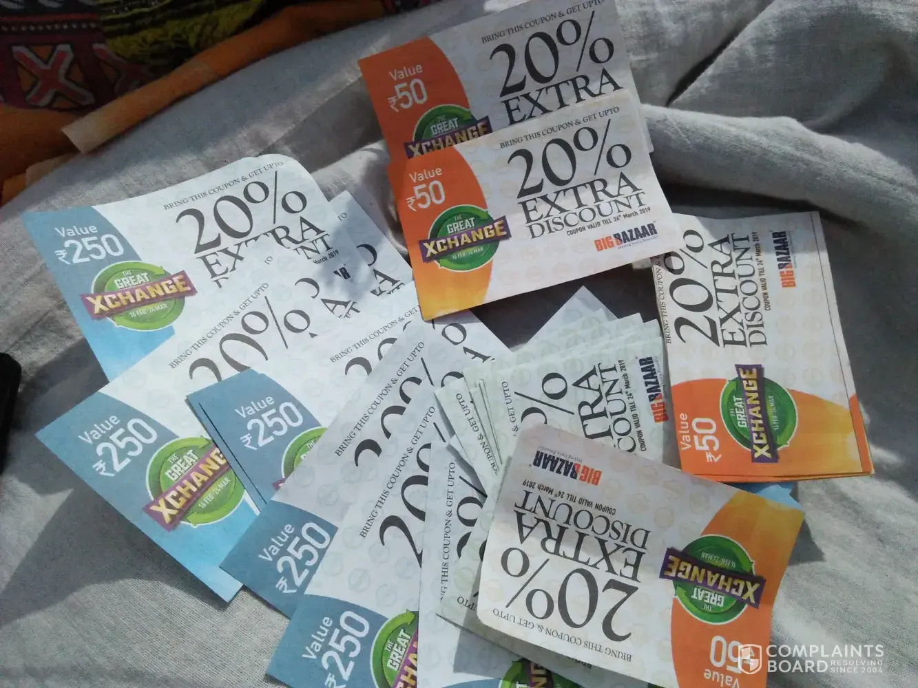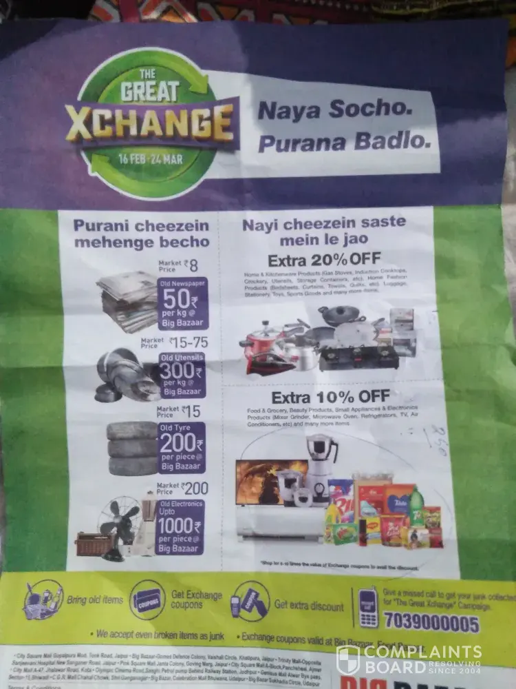 आपके दà¥à¤µà¤¾à¤°à¤¾ पà¥à¤°à¤•ाशित विजà¥à¤žà¤¾à¤ªà¤¨ को देखकर हम आज हम बिग बाजार में गठवहां पर पà¥à¤°à¤•ाशित the great xchange offer details को सही तरह से नहीं समà¤à¤¾à¤ गया और हम लोग को उनà¥à¤¹à¥‹à¤‚ने इसके बदले कूपन दिठइसका किस तरह से सामान लिया जाठयह नहीं बताया गया था जब हमने कूपन के बदले सामान लेना चाहा तो बोला10 परसेंट या 20 परसेंट ही कम होने कहां गया इतना ही कम होगा और बाकी पैसा आपको देना होगा हमारे पास 4750 के कूपन है मेरे पति की तनखà¥à¤µà¤¾à¤¹ 7000 में 1 माह में 40, 000 रà¥à¤ªà¤ का सामान कहां खरीद पाऊंगी कृपया कूपन वापस कर कà¥à¤› पैसा वापस देने का कषà¥à¤Ÿ करें