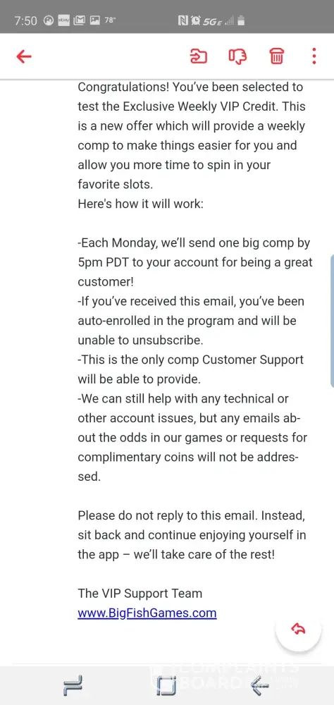 I'm due 126 mil my emails are being ignored I'm in touch with Jeff Karp executive of big fish games personal messages sent... Tate on customer service is ignoring my emails I'm fuming... I've paid now I want what I've paid for due now is 126 mil.. I'm saving and sending all corressponance to Jeff karp also.. so the quicker this matter is solved better for all.. and I'm in contact with Washington gamblers commission to... as this will have to go to next level if the right thing isn't sorted today.. receipts have been sent but ignored.. so I've paid now I want this adding to my account 126 mil owed onto my player is number [protected] thankyou..