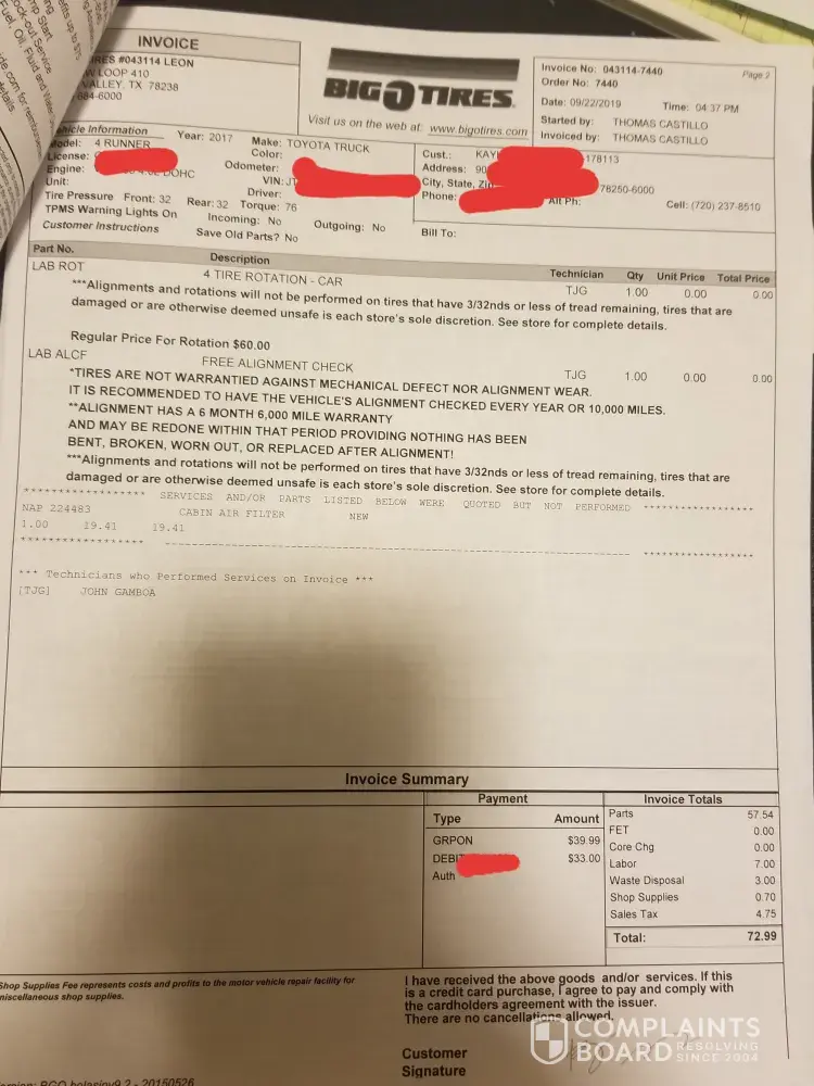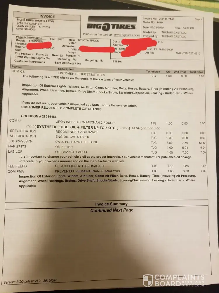 Read full complaintcustomer #: [protected] - front end / tires / brakes